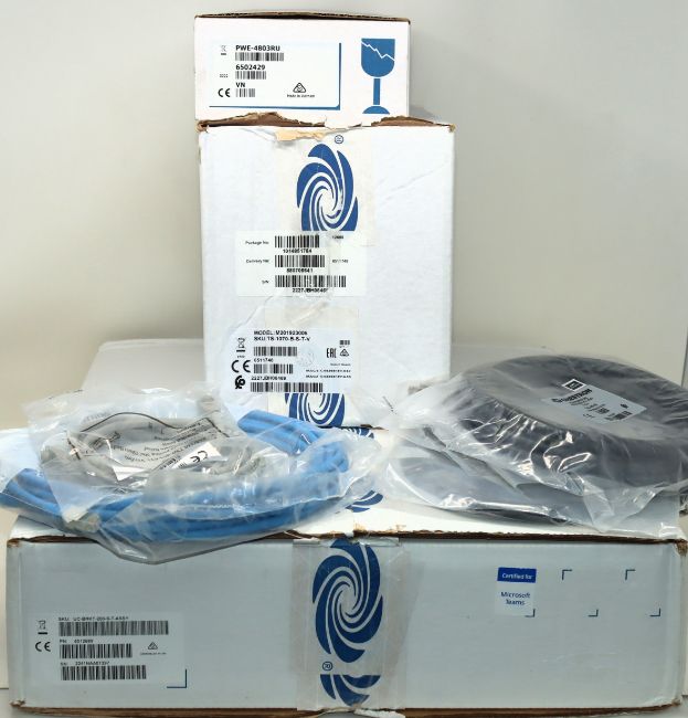 A Crestron TS-1070-B-S-T-V Tabletop Touch Screen in Black, a Crestron PWE-4803RU PoE Injector and a Crestron UC-BRKT-200-S-T-ASSY Engine (All items appear as new. Boxes open, some damage to packaging).