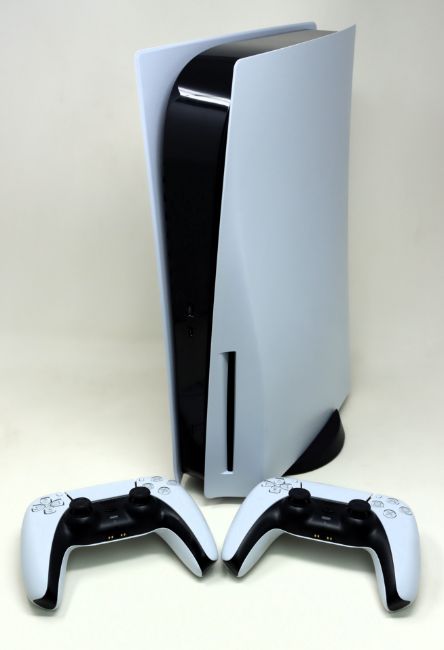 A pre-owned Playstation 5 Disk Edition with two controllers, HDMI and USB-C cables (Factory reset. Some damage to stand).