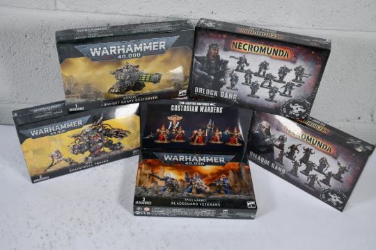 Six as new Warhammer 40,000 Miniatures to include Necromunda Orlock Gang, Necromunda Delaque Gang, Ghazgkull Thraka, Bladeguard Veterans, Lokhurst Heavy Destroyer and Custodian Wardens.