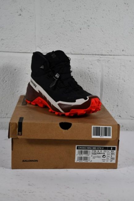 A pair of as new Salomon Cross Hike Mid GTX 2 in Black/Bitter Chocolate/Fiery Red, Size UK 8.5.