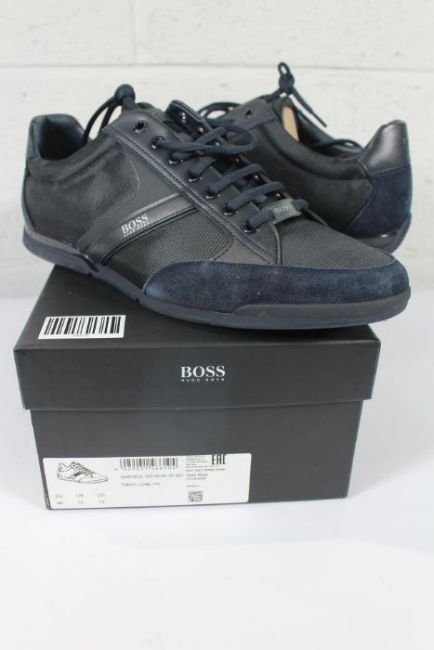 A pair of men's boxed as new Boss Saturn Low Profile Trainers - Dark Blue (UK 12).