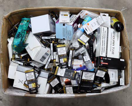 A quantity of assorted as new vaping liquids and accessories (Over 18's only) (One box. All items sold as seen).