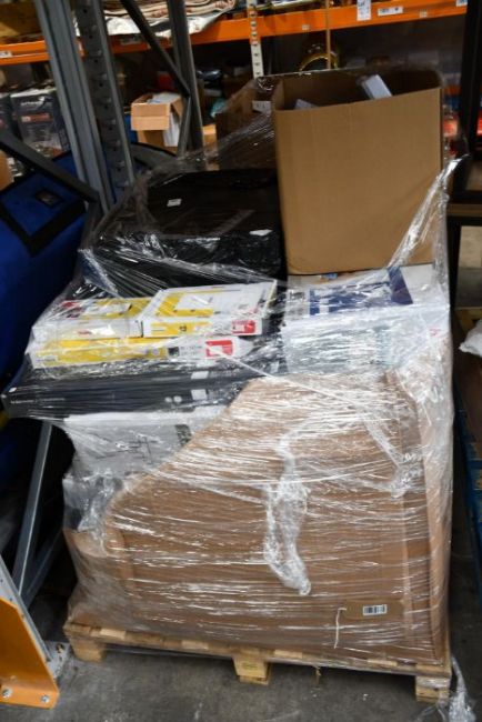 A pallet of returns to wireless headphones, Hama TV brackets and coffee capsule stands (Viewing advised).