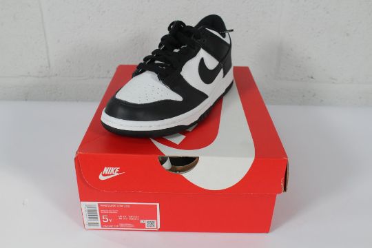 A pair of juniors boxed as new Nike Dunk Low (GS) - CW1590 100 - White/Black (UK 4.5).
