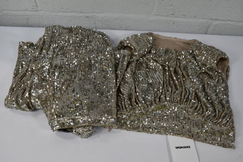 A pair of Womance sequined fit and flare side zip nude trousers and matching sleeveless crop top (Size unknown but looks approximately UK 8/10).