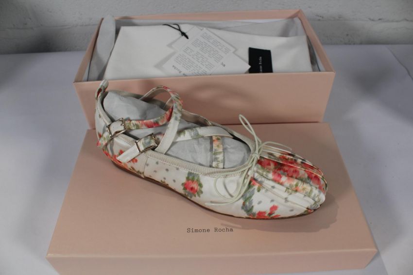 A pair of women's boxed as new Simone Rocha 5mm Round Criss Cross Ballerina Flats - Floral Print (EU 38).
