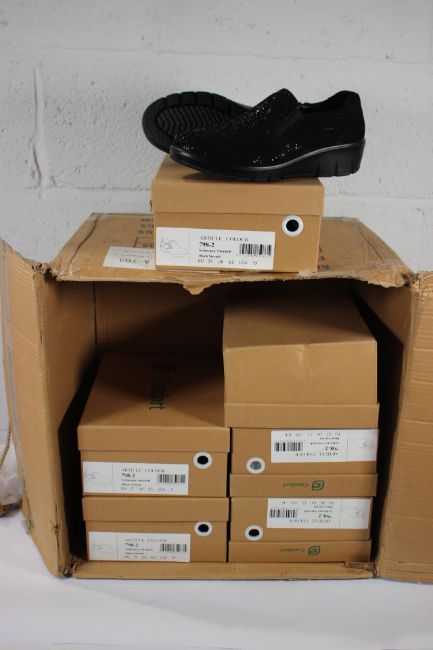 Six boxed as new G Comfort 798-2 Black Stretch Shoes (Sizes 1x UK 3.5, 1x UK 4.5, 2x UK 6, 1x UK 6.5 and 1x UK 7).