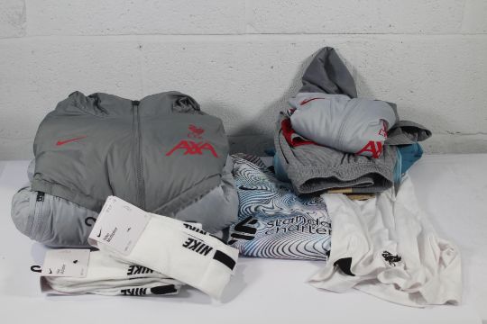 Eight items of as new Nike Clothing to include a Nike x Liverpool Dri-Fit Jacket in size M, two packs of as new Nike Multiplier Dri-Fit Socks and other related items.