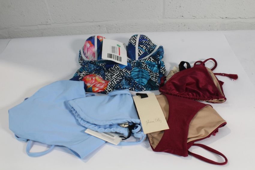 An as new Casa Raki light blue triangle bikini (Size top S, bottoms M), an as new Johanna Ortiz dark pink triangle bikini (Size top S, bottoms M) and an Emporio Armani one piece floral swimsuit (Size XS).