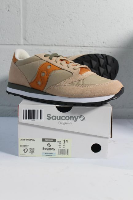 A pair of boxed as new Saucony Jazz Originals Trainers in Khaki/Orange, Size UK 13.