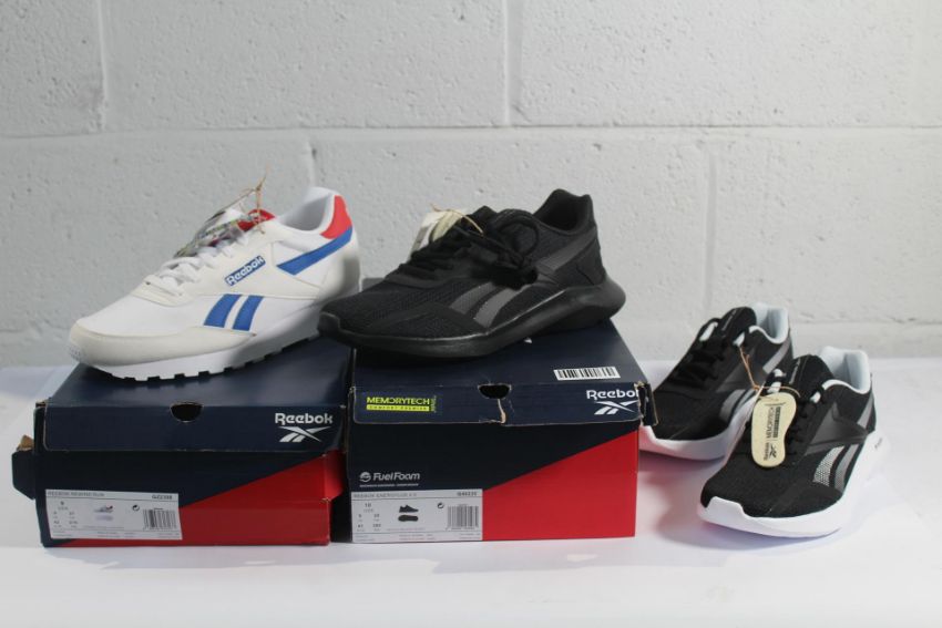 A pair of Reebox black/white EnergyLux 2.0 running trainers (UK 6) (Unboxed), a pair of Reebox Rewind Run blue/red/white running trainers (UK 8) and a pair of black Reebox EnergyLux 2.0 running trainers (UK 9).