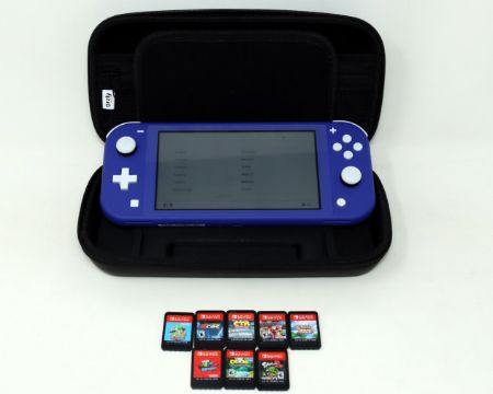 A pre-owned Nintendo Switch Lite (HDH-001) Hand-Held Game Console in Purple with eight assorted game cards in case.
