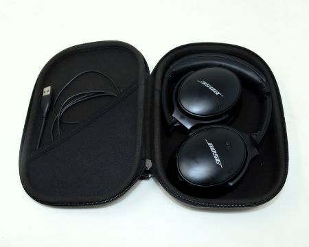 A pre-owned pair of Bose QuietComfort 45 Wireless Noise Cancelling Over-Ear Headphones in Black with Case, 3.5mm Cable & USB-C Cable (Grade B).