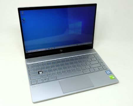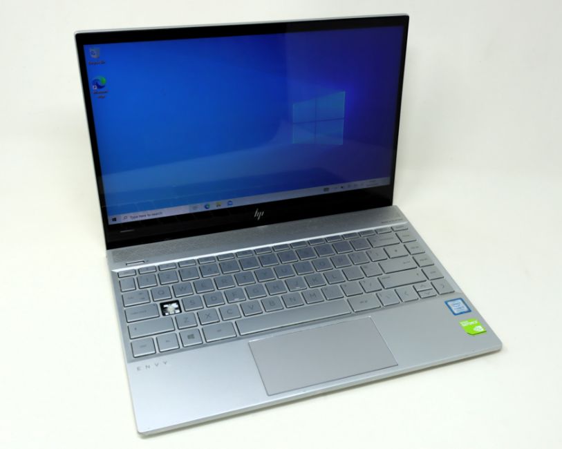 A pre-owned HP Envy 13-ah0003na 13.3" Touchscreen Laptop in Silver with Intel Core i7-8550U 1.80GHz CPU, 16GB RAM, NVIDIA GeForce MX150 GPU, 512GB SSD running Windows 10 Home (Grade D - 'A' key missing, general wear, light dents and scratches. No charger included) (P/N: 4EY21EA#ABU S/N: 8CG84030TC).