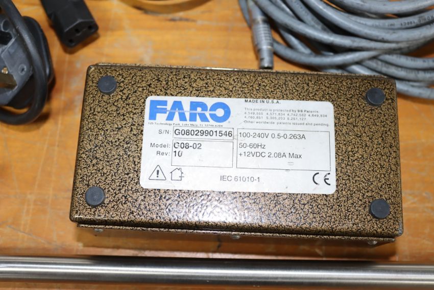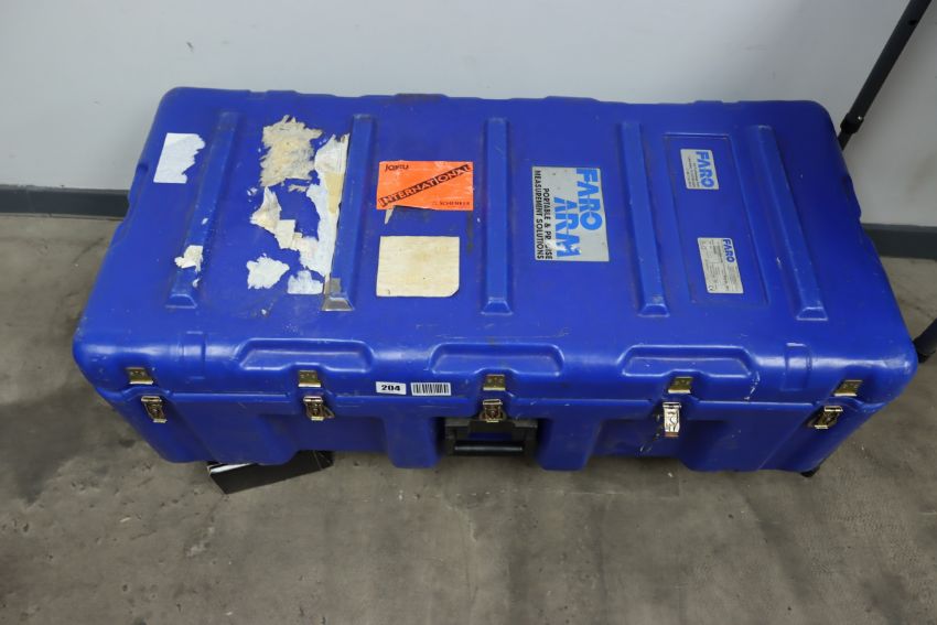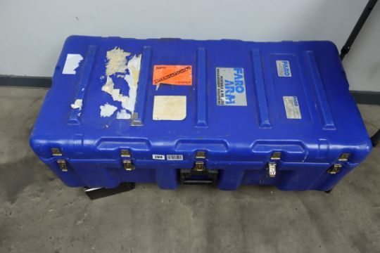 A pre-owned Faro Gold Measuring Arm with accessories in a wheeled flight case (Case missing one castor wheel) (Viewing advised, sold as seen).