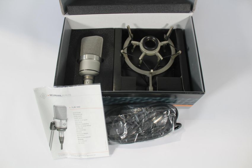 A Neumann TLM 102 Studio Set Microphone + Shock Mount (Nickel) (Possibly pre-owned).