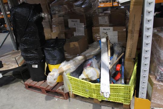 A quantity of tools and related items to include shovels, spirit level and dustbins.