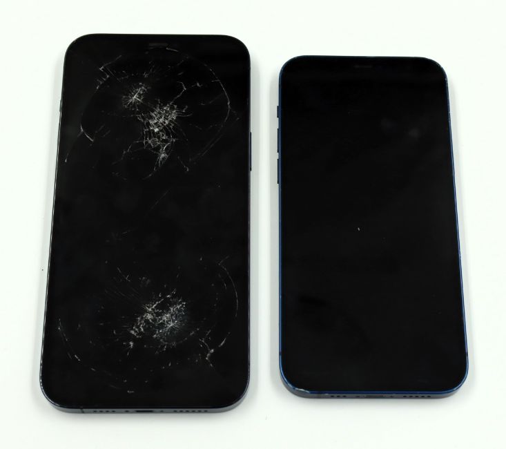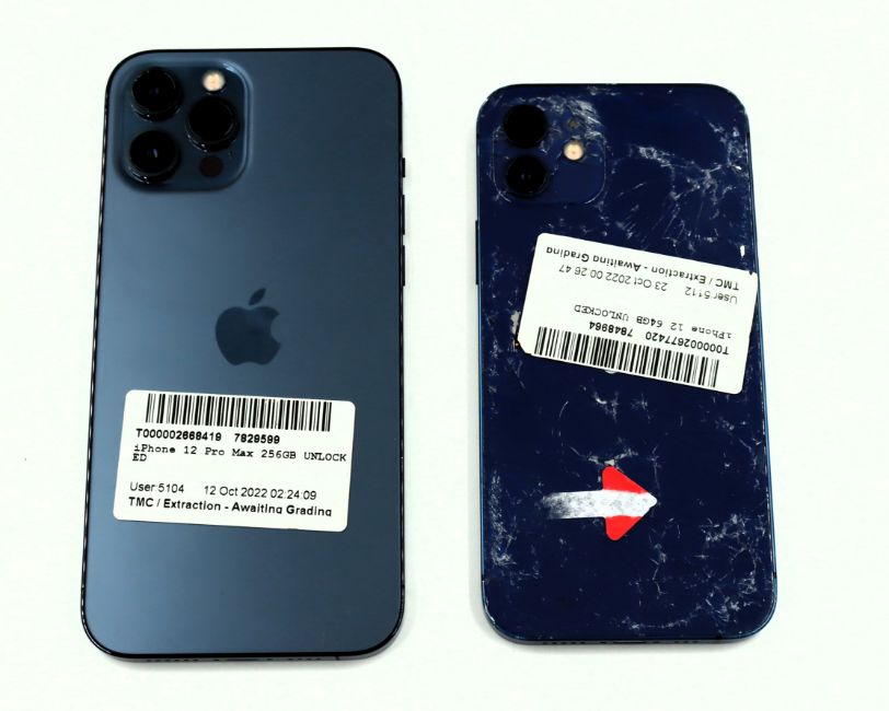 A pre-owned iPhone 12 Pro Max (Global/A2411) 256GB and an Apple iPhone 12 (Global/A2403) 64GB sold for parts (Both iCloud account clear. Grade F. Sold for parts only).