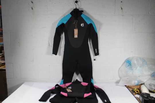Two junior's Gul 2023 G Force 3mm flatlock steamer wetsuits Black/Zafer Black/Pink (Size 2 x XL).