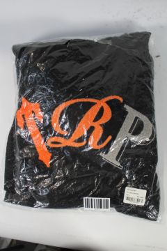 An as new Trapstar Chenille TRP Short Set in Black/Orange, Size Large.