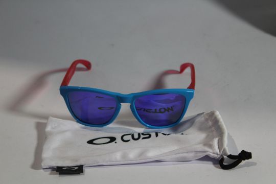 pair of Oakley custom blue with purple/pink arms sunglasses no case.