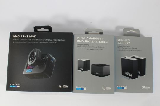 A GoPro Max Lens Mod (HERO10 Black/HERO9 Black), a GoPro - Dual Battery Charger + Enduro Batteries and a GoPro Enduro 1720mAh Rechargeable Lithium-Ion Battery for HERO9/10, 2-Pack, all boxed as new.