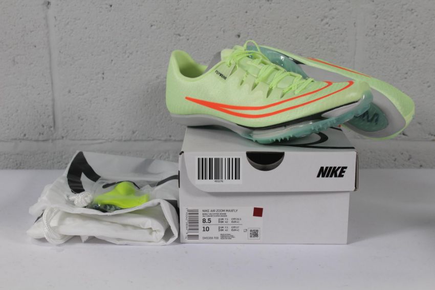 A pair of as new Nike Air Zoom Maxfly Track and Field Sprinting Spikes in Barely Volt/Hyper Orange, Size UK 7.5.