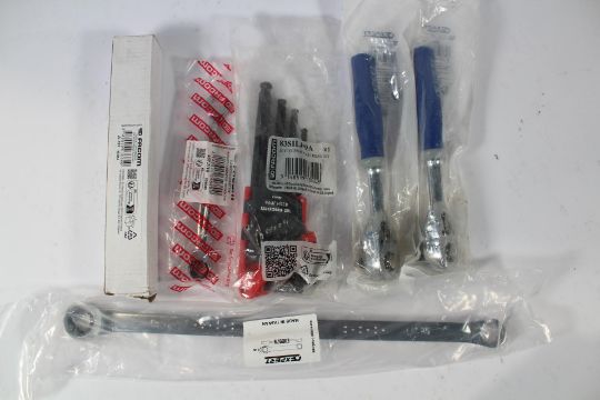Six as new Facom Tools to include 2x E031706 3/8" Pear Head Ratchet, 1x E110979 Extra Long Ring and Ratchet Ring Spanner 17mm, 1x Combination Ratcheting Wrench 7/16, 1x FCMJL161 Sealed Pear Head Ratchet 3/8in Drive and 1x 83SH.JP9A Hexagon Key Set 9 Piece Long Sphere Metric.