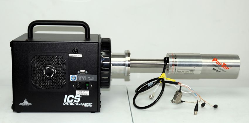 A pre-owned Ortec GEM10P4-70 PopTop Photon Detector with an Ortec CFG-ICS-P4 Integrated Cryocooling System in a foam lined flight case (Untested, sold as seen).