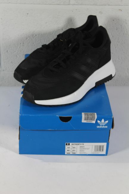 An as new pair of Adidas Retropy F2 Trainers in Black/White, Size UK 11.5 (Box Damaged).