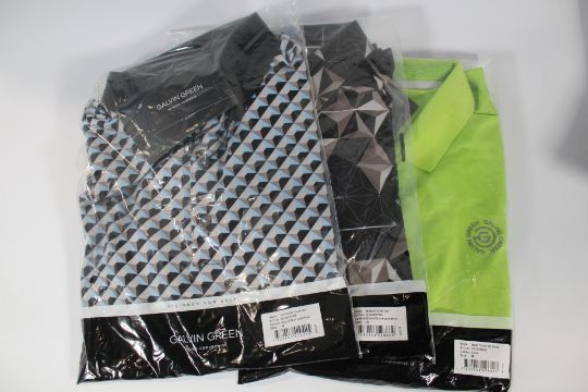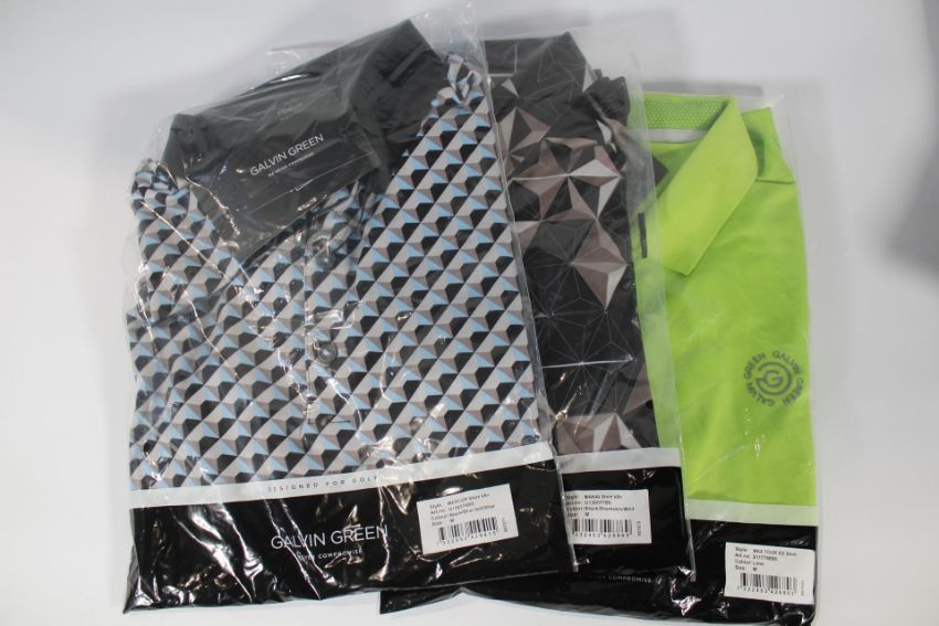 Three as new Galvin Green polo shirts: Makai - Black/Sharkskin/White, Mercer - Black/Bluebell/Shark and Max Tour - Lime (All Medium).