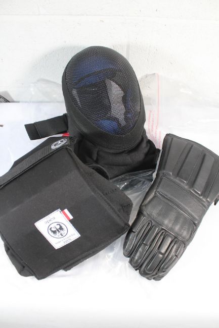 Faits D'Armes Fencing Mask 350N, SPES Trinity Mask Overlay 350N and Faits D'Armes Kevlar Gloves (M).