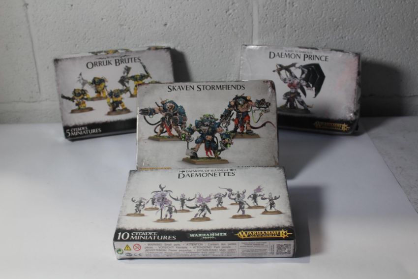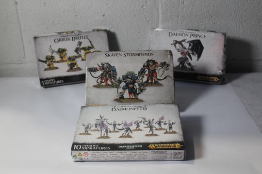 Four assorted Warhammer model kits to include Orruk Brutes, Daemon Prince, Daemonettes, Skaven Stormfiends (Outer boxes Sealed but boxes have slight damage).