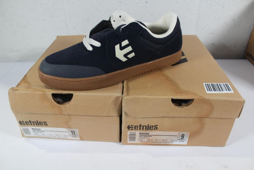 Two pairs of men's boxed as new Etnies Marana Skate Shoes - Navy/Gum/White (UK 8, 10, some water stains to boxes).