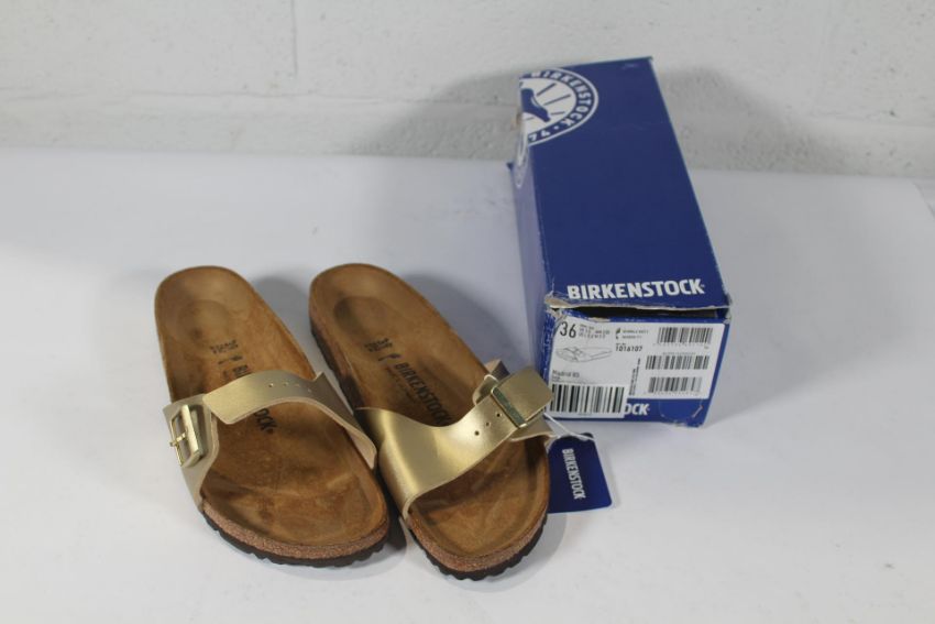 A pair of as new Birkenstock Madrid BS Sandals in Gold, Size UK 5.5 (Box Damaged).