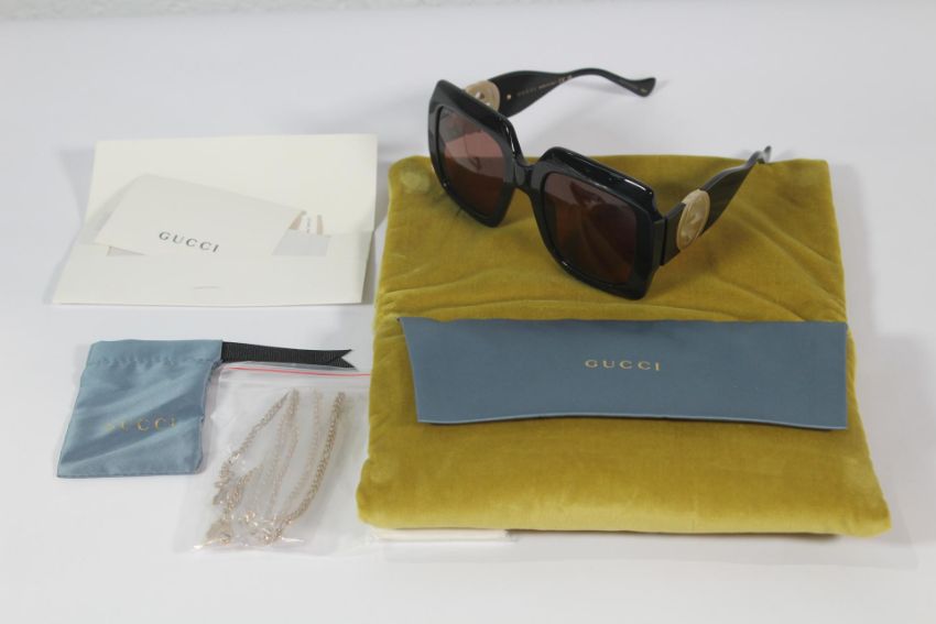 Gucci Sunglasses Black Frame and Brown Lens with Gold Colour Safety Chain Contained in a Green Velvet Soft Pouch.