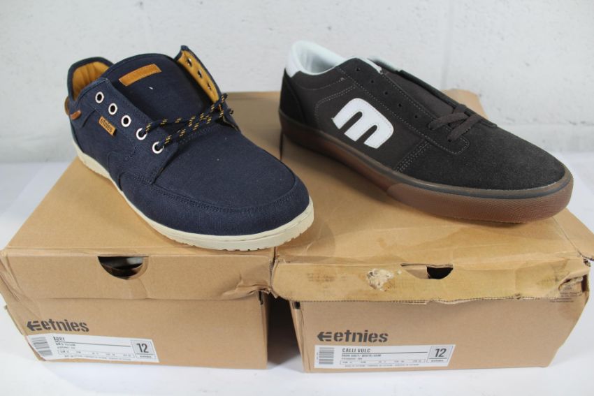 Two pairs of men's as new Etnies skate shoes: Dory - Navy/Yellow (11) and Calli Vulc Dark Grey/White/Gum (11) (Some water damage to box).