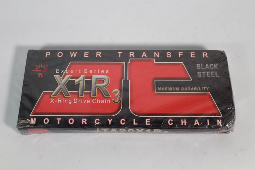 An as new JT Power Transfer Expert Series 520 X1R3 X-Ring Drive Chain Motorcycle Chain, 112 DL Black Steel.