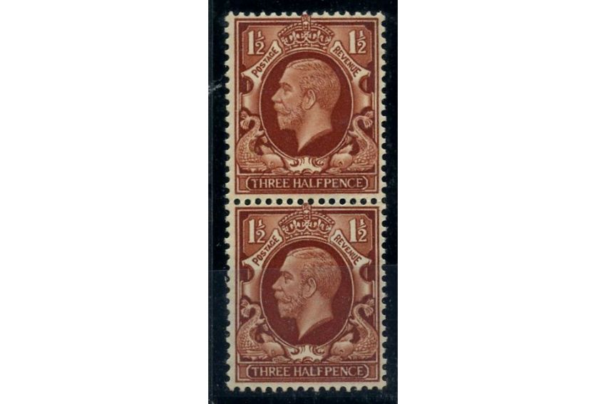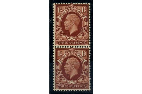 GB 1934 1-1/2d Red-brown, vertical paper join pair, with top stamp double thickness, mtd mint. SG441