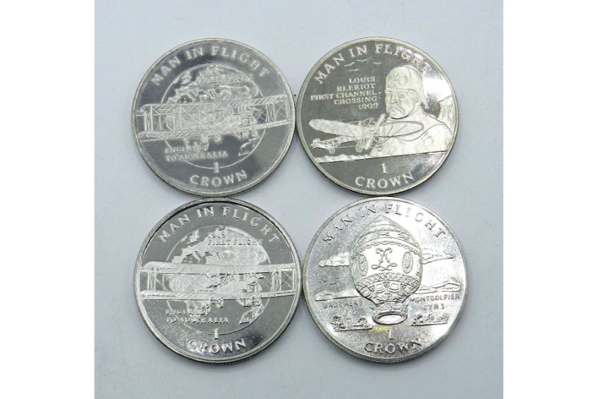 A lot of 4 'Man in Flight' Isle of Man Crowns, issued in 1994-95. A great thematic gathering!