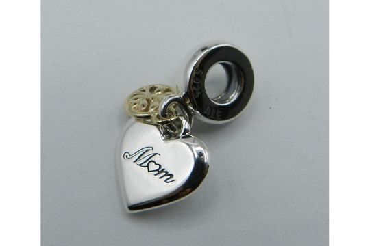 Pandora two-tone family tree and heart dangle charm. Includes a large heart-shaped disc with 'Mum' engraved on the front with the 'u' replaced by a heart while 'You are the heart of your family' features on the back aside a 14k gold dangle disc with a round frame and an openwork family tree motif. Metal: Sterling silver and 14k gold. Dimensions: Depth 2.6mm, Height 11mm, Width 11.4mm