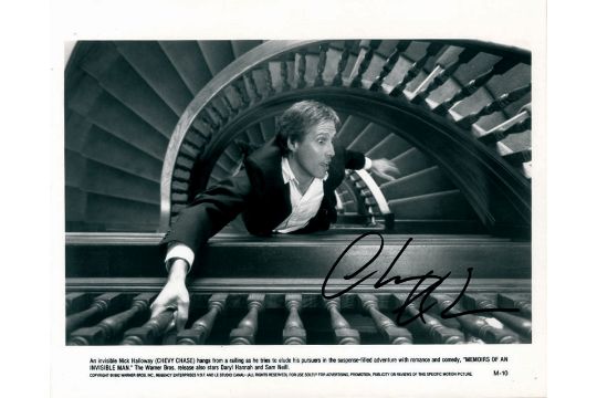 Head and shoulders length, black and white photograph of Chase in a scene still from the 1992 film, 'Memoirs of an Invisible Man'. Signed across the lower right corner of the piece in bold black ink.