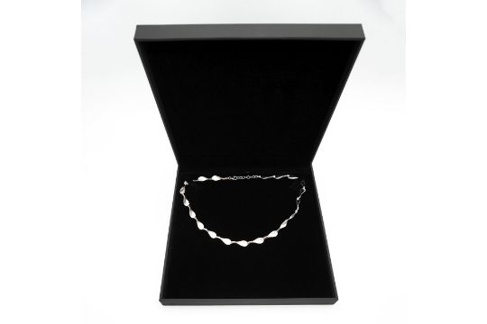 Stunning sterling silver twisted petal shaped links in brushed satin with a polished rose gold  accent. Each link measures 1cm x 1.5cm, the necklace is 42 cm long and weighs 21g.  Comes in a gift box.