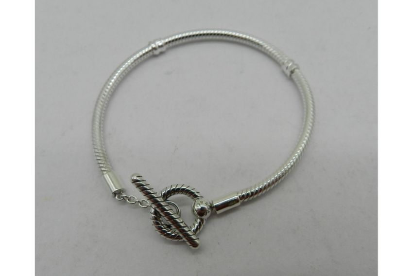 Pandora Moments t-bar snake chain bracelet. Features a T-bar double circle closure and a snake chain pattern. Holds 15-20 Pandora Moments charms and dangles. Metal: Sterling Silver. Dimensions: Depth 4.8mm, Height 21.34mm, Width 13.8mm. Size 18cm