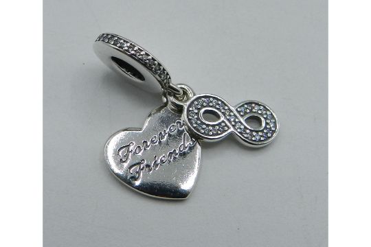 Pandora Forever Friends heart dangle charm. Features a heart-shaped disc with the engraving 'Forever Friends' next to a sparkling infinity sign. Metal: Sterling Silver. Dimensions: Depth 2.83mm, Height 13.9mm, Width 11.65mm