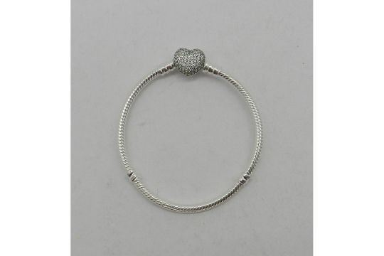 Pandora Moments sparkling heart pave clasp snake chain bracelet. Features a reversible heart-shaped clasp set with shimmering pave stones on one side and embossed with the Pandora logo on the reverse and has the iconic snake chain bracelet. Metal: Sterling Silver. Dimensions: Depth 9mm, Height 10.2mm, Width 11.5mm. Size 16cm