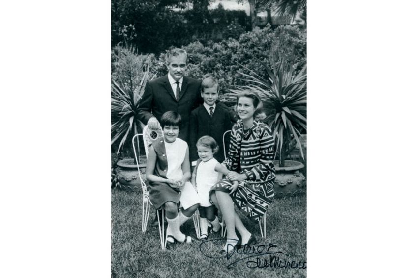 A black and white family photograph of Grace Kelly, Prince Rainier and their children. (circa 1968) and clearly signed by Her as 'Grace de Monaco'.