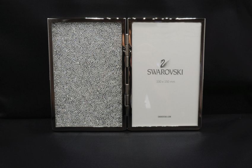 Display your favorite photos in style with this stunning hinged picture frame. The elegant design in polished silver-tone metal gleams with 6’300 clear crystals and can accommodate two standard size photos. Measuring 15.7 x 10.9 x 1.9 cm.  In original packaging