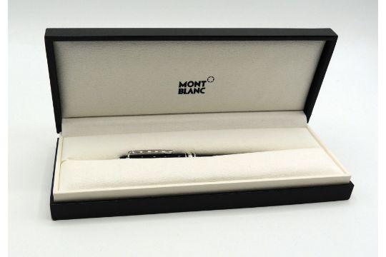 The cap and barrel are crafted in black precious resin featuring the iconic white Montblanc emblem inlaid in the cap top. The pen is adorned with a handcrafted rhodium-coated 18ct solid gold nib. Length 113mm. Nib M. Brand new in box.