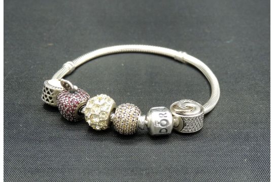 Sterling silver Pandora charm bracelet with 5 vintage Pandora charms. Bracelet length 20cm.